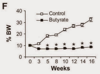で、さらに面白いのが、2009年に出た論文(7)でして、マウスに大量の高脂肪食を与える実験を行ったところ、同時に酪酸を与えられたマウスは体脂肪の上昇率がハンパなく低かったんですな。下のグラフの「Butyrate」が、酪酸を与えられたマウスのデータであります。