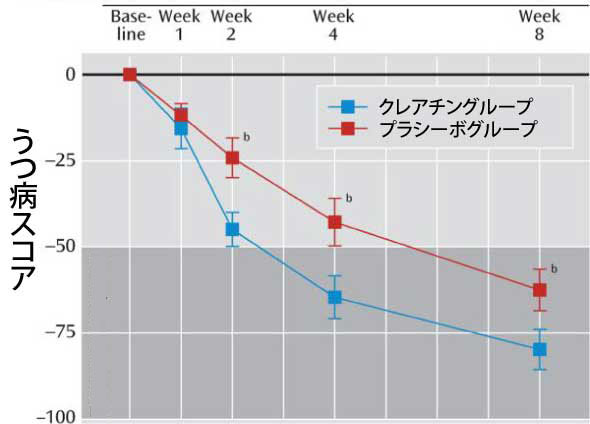 ご覧のとおり、クレアチンを使ったグループのほうが、うつの症状がガッツリと改善しております。これはなかなかの成果じゃないでしょうか。